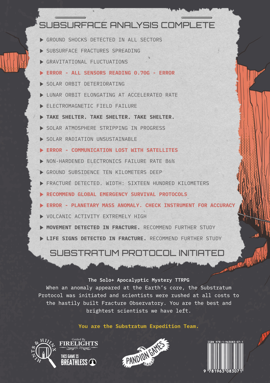 A solo+ survival mystery TTRPG utilizing step-down dice and card draw mechanics, Substratum Protocol is playable as both a solo game or guided by a GM.