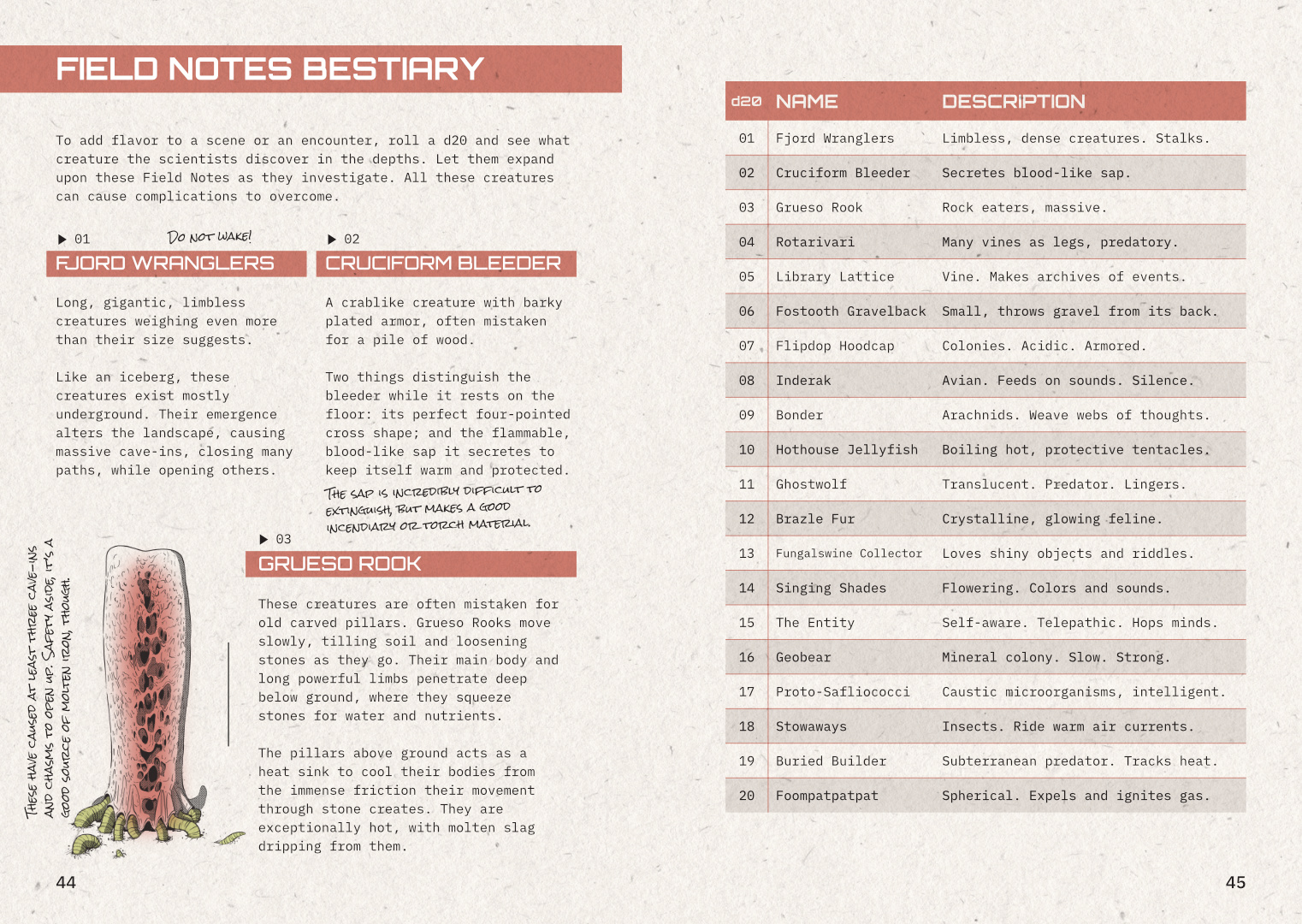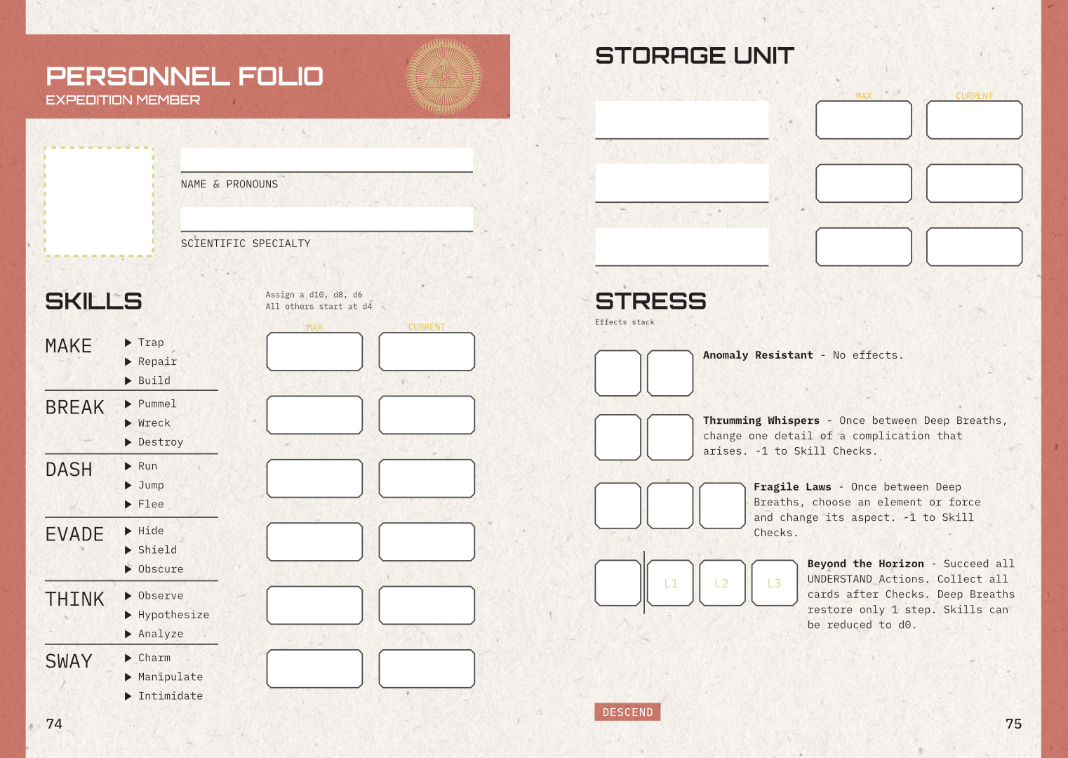 Substratum Protocol supports two styles of solo play - a more complex, free form method similar to playing multiplayer, and the original Hints and Hijinx format of solo play that is quicker to pick up and play through an expedition. Both are a ton of fun and give you room to explore and discover new mysteries on each play through. All the members in your team, creatures you meet, dice rolls, adventures, clues, setbacks and successes of your expedition can be captured in a book to look back on or share.