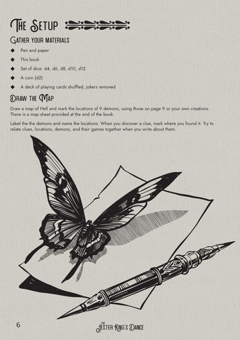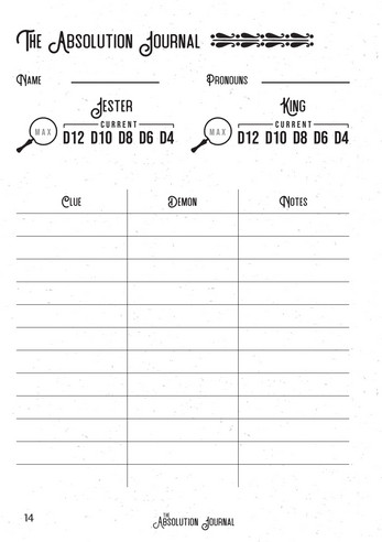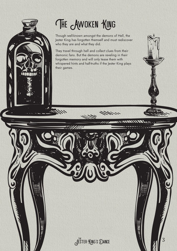 The Jester King's Dance is a solo journaling mystery game. That is explored by yourself by documenting in a notebook the tribulations of the Jester King and piecing together clues to uncover who they once were and their careless, evil deeds.